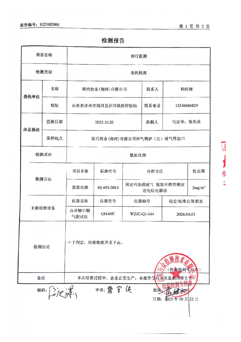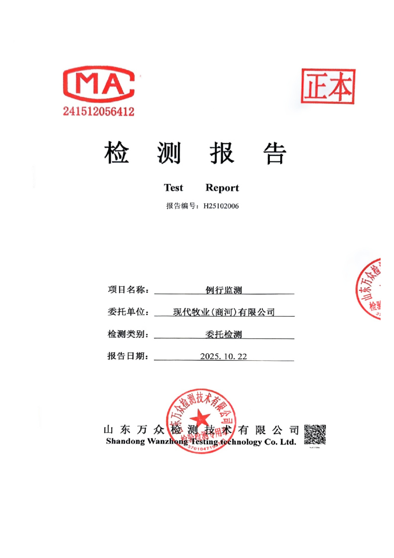现代牧业(商河)有限公司2025年10月例行监测检测报告环境信息公开表